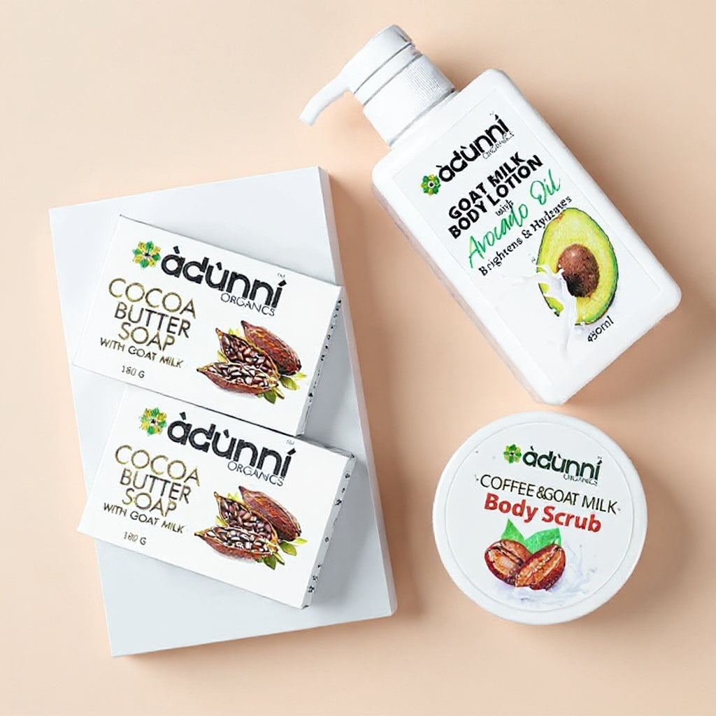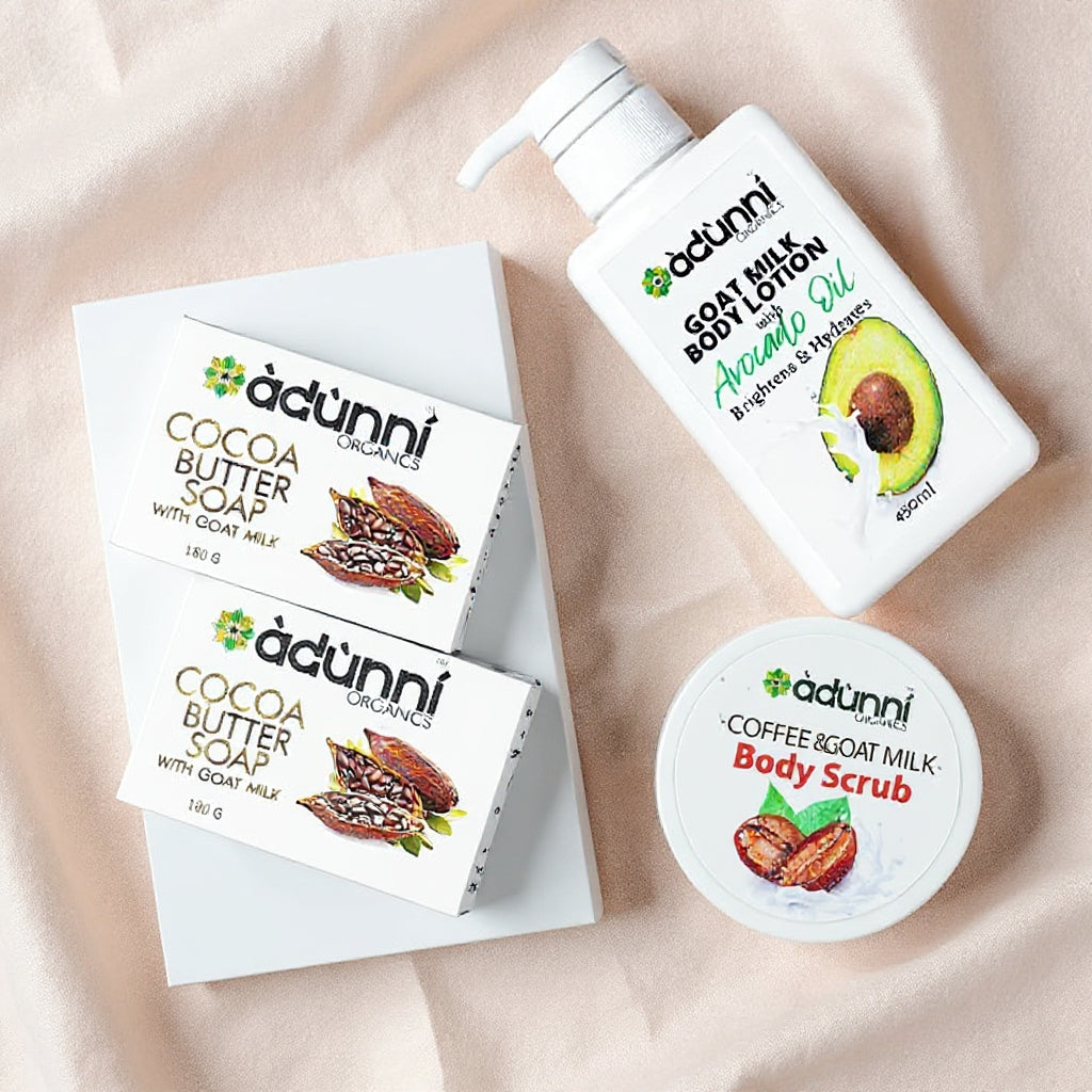 Use the Cocoa Butter Soap to bathe and moisturize with the Goat Milk Lotion once or twice daily.